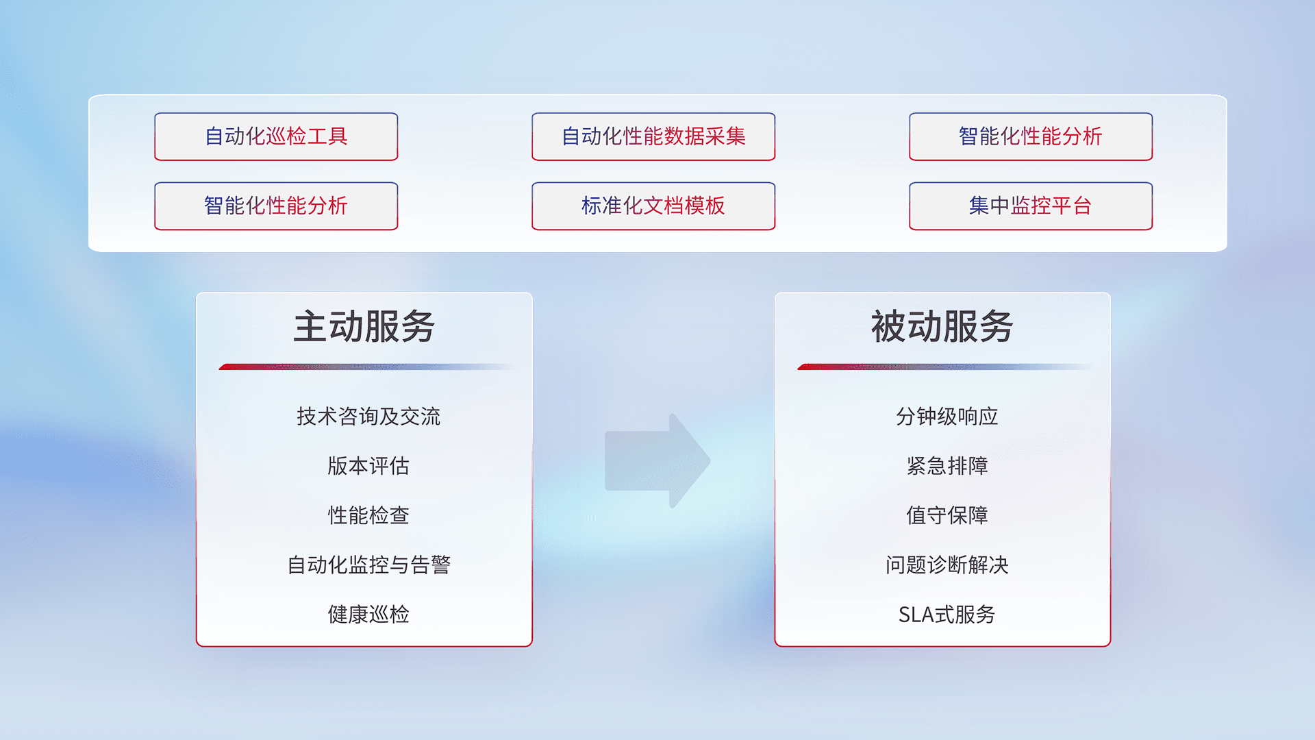 智能化工具和标准化文档,,,保障服务质量,,,,提供主动服务(包含技术咨询、、、版本评估、、、性能检查、、自动化监控与告警、、、、健康巡检)和被动服务包含(分钟级响应、、紧急排障、、、值守保障、、、问题诊断解决、、SLA服务)。。。。