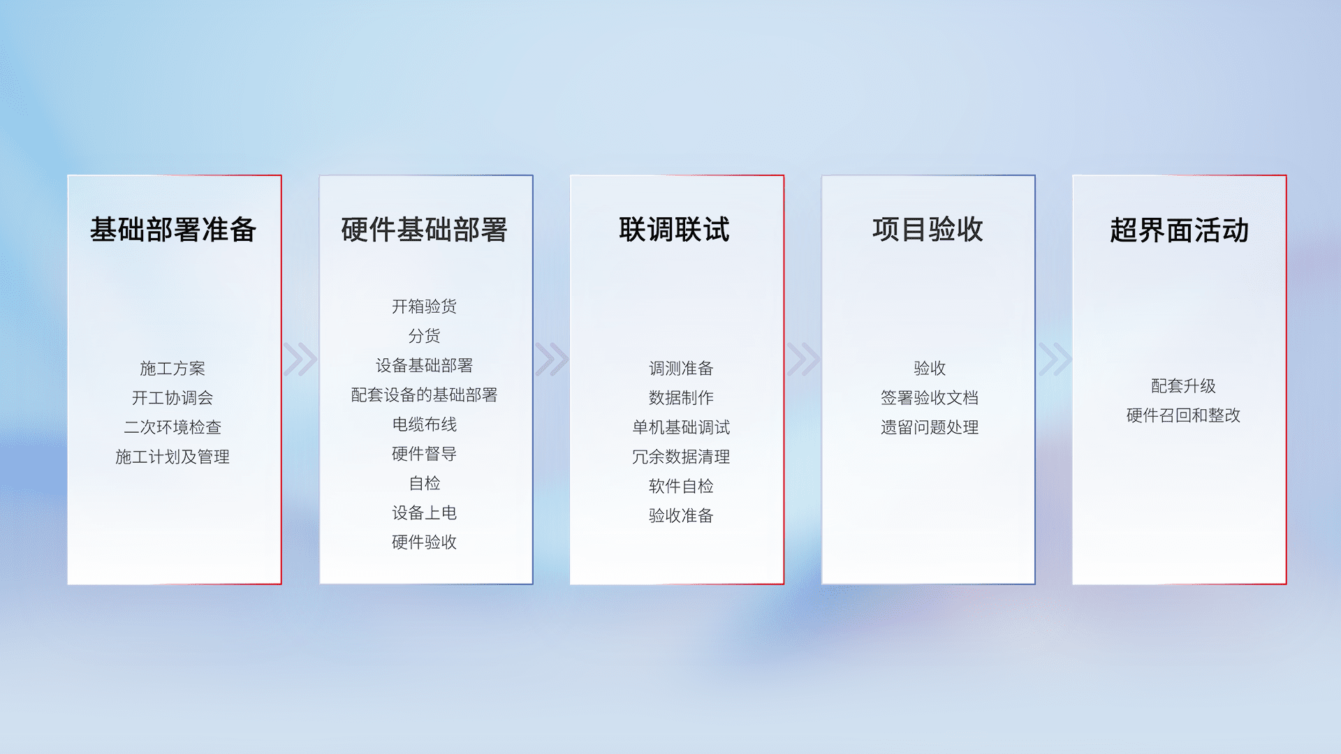 从基础部署准备、、硬件基础部署、、、联调联试、、项目验收、、、、越界面活动的全过程可追溯,,,保证施工质量和进度。。